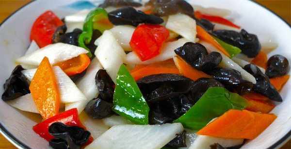 2、锅内烧水,倒入山药焯水20秒,倒出控干水分。再把木耳、青红椒倒入锅内焯下水,焯水30秒后倒出,用清水快速冲凉。