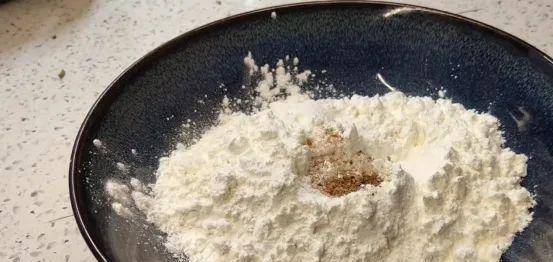 准备一个小碗,在碗中加入两瓢玉米淀粉,一瓢面粉,少许食盐入底味,再加少许花椒添加风味。