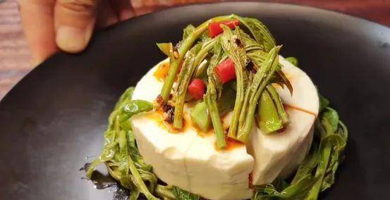 3. 烫好的豆腐切成小块,摆放上香椿,淋上红油,就可以享用了,非常简单省时。