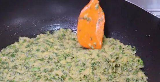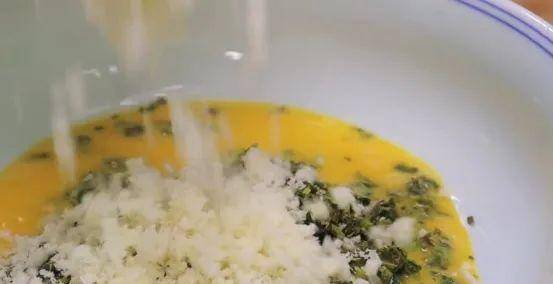 5. 剩下的香椿碎淋上鸡蛋液,倒上馒头碎,加盐拌匀。用馒头碎来代替面粉,口感会更好。