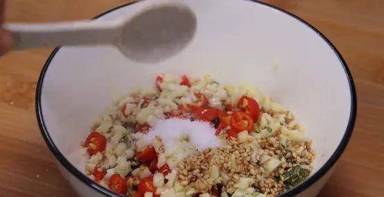 4. 把两勺香椿碎舀入碗中,加切好的小米椒、剁碎的蒜末,撒上一把白芝麻,淋上锅里的热油,使香味被激发出来。再加少许盐,一勺生抽,充分拌匀,做成香椿酱。