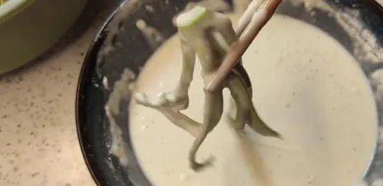 2. 往里面倒入适量的水,边倒边搅拌,直到成糊状。然后加少许食用油,再次用筷子搅拌均匀,放置备用。把洗好的香椿夹入面糊中,让香椿表面都裹上面糊。