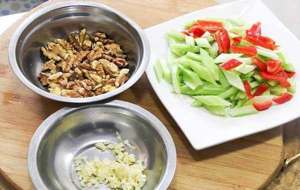 1.准备西芹一棵掰散,扯去茎上的老筋放入清水中,清洗干净后捞出,把芹菜从中间破开,斜刀切成菱形片备用;红椒半个,先切成条再切成菱形片,和芹菜放在一起;核桃仁200克;大蒜几粒,拍散后切成蒜末。