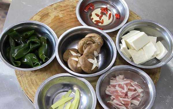 1.准备香菇几朵,把根切掉,在香菇上切出十字花;准备洗净的海带结一把放入盆中备用;枸杞一小把,加入适量的清水浸泡。
