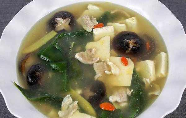 5.10分钟以后把豆腐倒入锅中,继续炖煮3分钟,让豆腐的营养融入汤里面,加入食盐3克,胡椒粉2克,淋入一点芝麻香油,撒上葱花,美味即成。