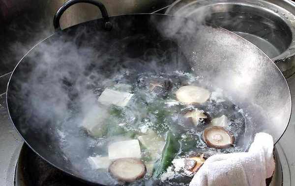 4.锅内再烧水,放入切好的姜片,加入食盐2克,胡椒粉1克给食材入底味,大火把水烧开,倒入香菇海带结和切好的豆腐,保持开大火,煮出豆腐中的杂质,用勺子打去浮沫。