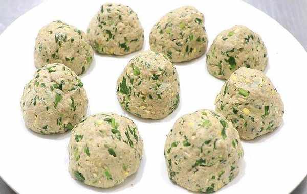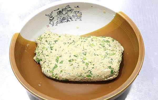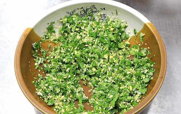 1.准备一小碗黄豆,提前一晚泡上,倒在案板上面用刀背压碎,压碎以后捡一下豆皮,捡干净以后把黄豆切碎放在盆中;大葱白两段,切成葱花再剁碎末,和黄豆放在同一个盆中,再切点芹菜叶也放进去。