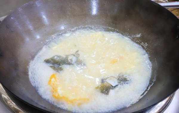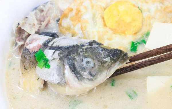 4.鱼头煎至两面金黄时倒入适量的开水,千万不要加凉水,容易使蛋白质凝固,不能充分炖出里面的胶原蛋白,放入煎好的鸡蛋,盖上锅盖,开大火炖煮10分钟,一定要开大火,这是鱼汤浓郁奶白的关键。
