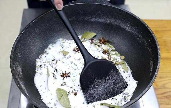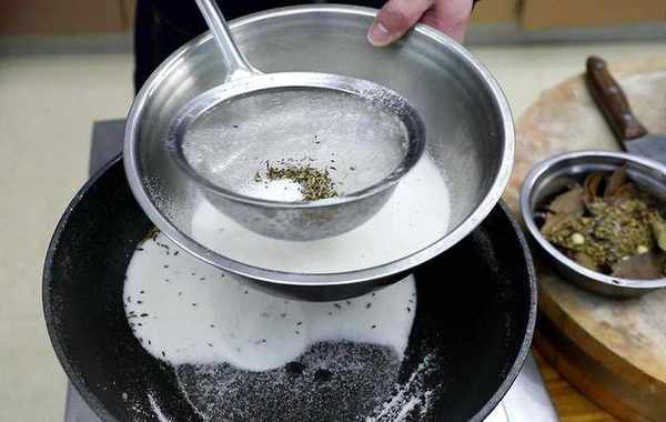 4.食盐微微发黄以后关火再焖一会儿,让咸香味相互融合渗透,闻到浓郁的香味以后,把里面的料渣筛出来,只用炒好的食盐。