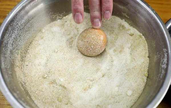 5.鸡蛋完全晾干水分以后,碗中倒入适量的高度白酒,在炒好的椒盐中,加入一包十三香拌匀,把鸡蛋先沾一层白酒菌消毒,再裹一层椒盐,方便将咸香味渗入进去,用保鲜膜包住密封起来。整个过程能粘上生水、生油,不然鸡蛋容易变质。