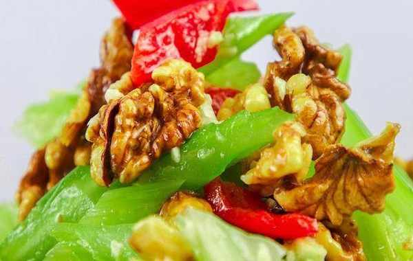 3.准备一个大盆,倒入切好的蒜末,加入食盐2克,味精1克,白醋3克,香油5克,把控干水分的芹菜和红椒倒入盆中,颠盆拌匀,倒入核桃仁再次拌匀后即可装盘,美味即成。