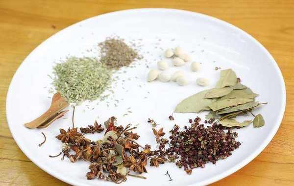 2.准备一些香料:小茴香、千里香、白果、香叶、花椒、八角、桂皮放入盘中备用。