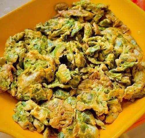 4、先把锅烧热,锅中加适量的油,烧至六成热后,倒入香椿和鸡蛋液,大火翻炒,顺便用铲子打散,蛋液全部凝固就做好了。