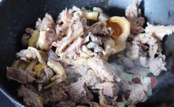 将准备好的鸭肉倒进去一起翻炒,炒至鸭肉出油变色。