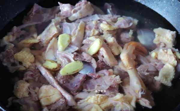 2、我们把准备好的鸭肉切块,放入一个干净的锅里,加入生姜片和适量的清水,然后开火给鸭肉进行焯水。