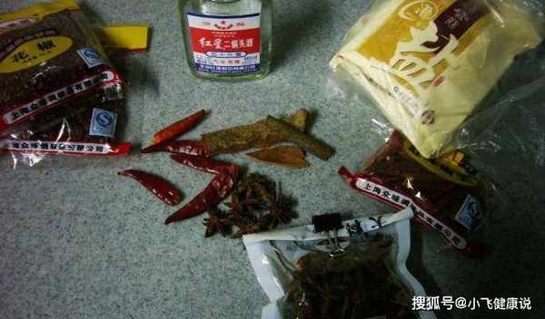 3、容器中放入适量的花椒、八角、月桂叶和少许桂皮,锅中烧开适量的水,加入一袋盐,让盐融化放凉,倒入将盐水倒入容器中,然后倒入20克优质白酒。盖上盖子密封好,放在阴凉通风处腌制一个月左右,即可出锅食用。