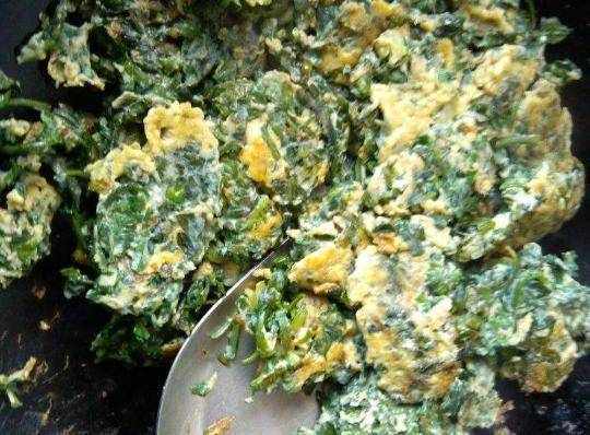 第六步:在平底锅中加热油。油烧开后倒入荠菜和鸡蛋液。蛋液成型并煮熟后,将其捣碎即可食用。