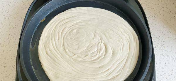4、取出揉好的面团,擀成圆形,在面团表面抹一层植物油锁水,盖上保鲜膜静置40分钟。
