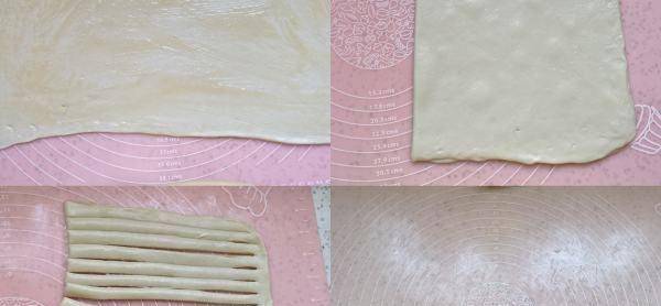 7、取一张面团,用擀面杖擀成长方形,把油酥倒在面团上,均匀地摊开,形成薄薄的一层。将面团向右对折,叠在一起,用切面刀把面团切成面条。条状,注意不要切到面团的边缘,再次揭开切好的面团,从上到下卷起来,擀成圆筒。