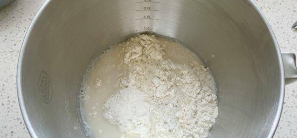 2、将4克食盐放入热水中,用筷子搅拌融化备用。将中筋面粉放入厨房机器的碗中,倒入融化的盐水。