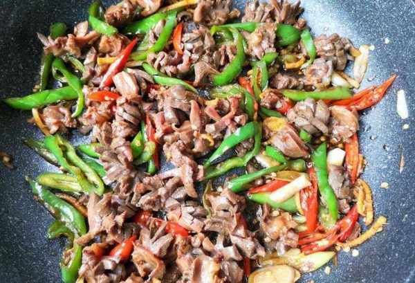 第三步:锅烧热,倒入适量油,油热后放入葱姜蒜爆香,然后倒入鸭肚翻炒均匀,加入青红加辣椒炒碎,加适量生抽、蚝油炒匀,加适量盐和糖炒匀后起锅。