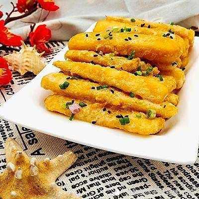 (4)锅中热油放入山药条炸至金黄色捞出控油待用。