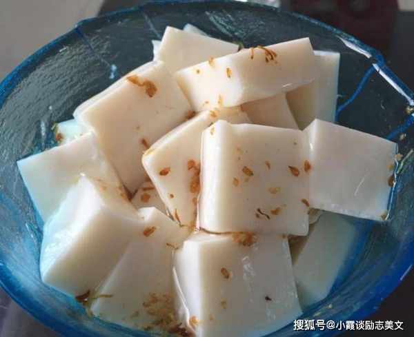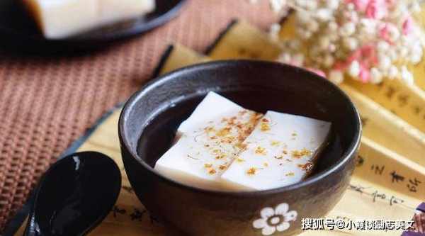 第三步:冷却后的牛奶杏仁露放入冰箱冷藏两小时,取出待变硬后切块,撒上蜂蜜和桂花糖即可食用。