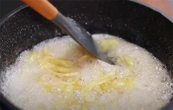 3.现在我们开始熬糖稀,300g白砂糖,120g清水,清洗好的姜片,刚开始的时候我们先开中火,搅了一会儿到沸腾的状态之后,火候就调成小火,开始不停的搅拌。