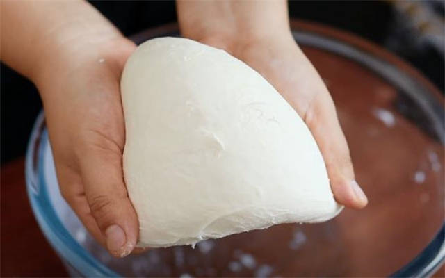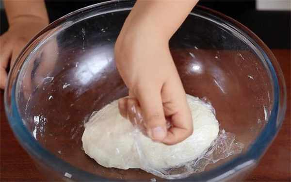 2.在饧面的过程中,它的表面会变得特别光滑而且平整,这个时候你再去揉,就能很容易的揉光滑了,继续封上保鲜膜饧上20分钟。