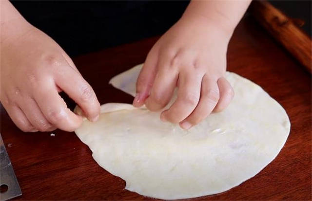 6.在饼皮的半径处切一刀,然后顺着这个褶直接卷起来,封口的位置一定要收紧了,防止漏酥。