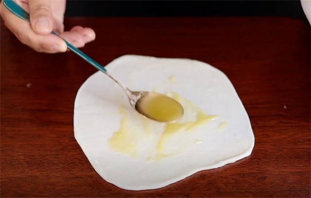5.中间的位置抹上油酥面铺平,油酥面的做法是热油或凉油泼在面粉上,加调味料拌匀即可。