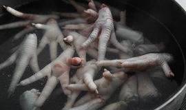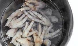 第一步:首先把鸡爪清理干净,然后在锅中放水,煮沸后放入鸡爪中火煮15分钟后捞出洗净。