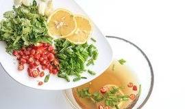 第三步:在浸泡鸡爪的过程中我们可以先把糟卤汁调制好,半瓶糟卤汁先导入碗中,然后加入准备好的香菜末、柠檬片、蒜末、小米椒、葱花等食材,搅拌均匀就可以了。