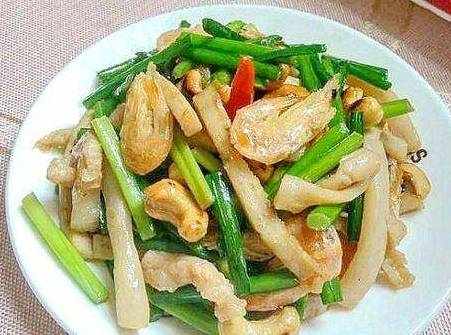 用料:鱿鱼100克、韭菜花150克、腰果50克、姜10克、鱼糕50克、虾干50克、里脊肉50克