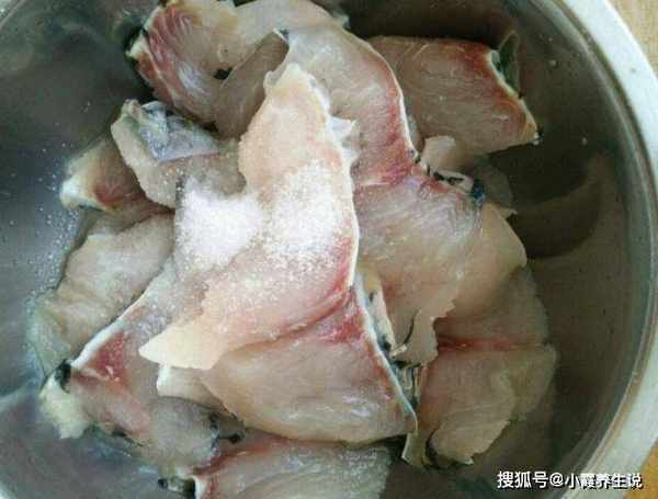 2、将洗净的鱼片放入大碗或大盘中,适当加盐拌匀,加入低味、去鱼腥味和杀菌,盐可以锁住鱼肉中的蛋白质,鱼肉会变软、嫩、紧,腌制3分钟后,用清水将鱼片表面的盐洗净,沥干水分备用。