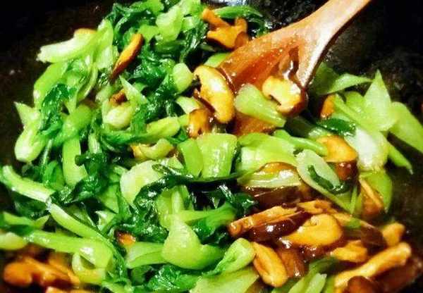 第五步:直到香菇破烂熟透,倒入小油菜籽,继续倒入适量的蚝油、生抽和盐,炒匀后装盘。