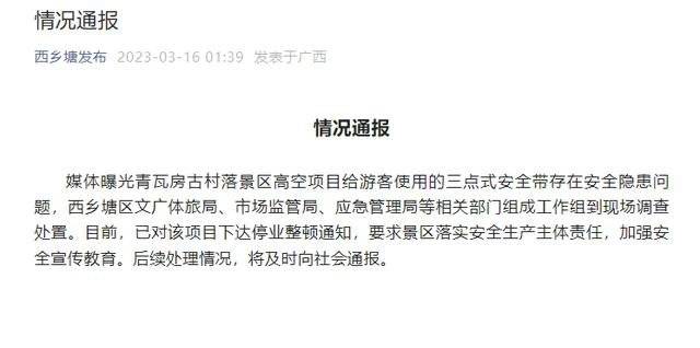 通报显示,媒体曝光青瓦房古村落景区高空项目给游客使用的三点式安全带存在安全隐患问题,西乡塘区文广体旅局、市场监管局、应急管理局等相关部门组成工作组到现场调查处置。目前,已对该项目下达停业整顿通知,要求景区落实安全生产主体责任,加强安全宣传教育。