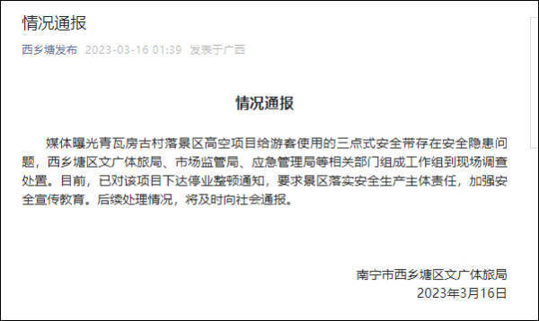 3月16日,南宁市西乡塘区文广体旅局发布情况通报:媒体曝光青瓦房古村落景区高空项目给游客使用的三点式安全带存在安全隐患问题,西乡塘区文广体旅局、市场监管局、应急管理局等相关部门组成工作组到现场调查处置。目前,已对该项目下达停业整顿通知,要求景区落实安全生产主体责任,加强安全宣传教育。后续处理情况,将及时向社会通报。