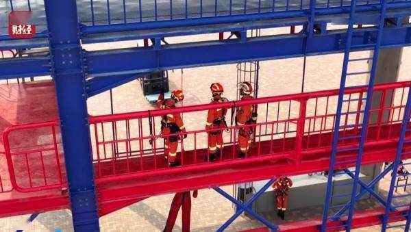 天津市消防救援总队 消防教官:五点式安全带的主要受力点,是我们的腰和腿部,不会快速脱落。