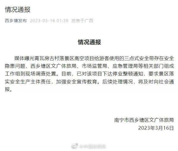 媒体曝光青瓦房古村落景区高空项目给游客使用的三点式安全带存在安全隐患问题。目前,已对该项目下达停业整顿通知,要求景区落实安全生产主体责任,加强安全宣传教育。