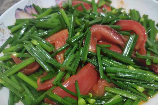 說真的我之前都是韭苔炒雞蛋,炒蕃茄還真是第一次做,沒辦法老婆的話就是聖旨,服從就可以了,要不下月零花錢又泡湯了。炒出之後味道還是不錯的,韭苔有潤肺護膚的作用,而蕃茄富含豐富的胡蘿蔔素,同樣還能健胃消食,美容護膚。韭苔再與蕃茄搭配之後其的鮮美,酸酸的口味很是不錯。