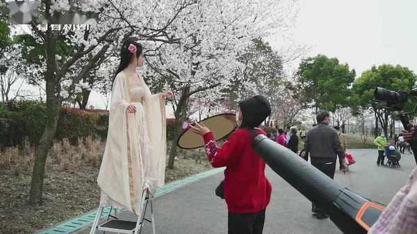 为了追求效果,甚至还有拍摄团队大力摇晃樱花树,来营造落英缤纷的氛围,有的甚至直接将梯子放到了道路中间,丝毫不管对游客正常通行的影响。