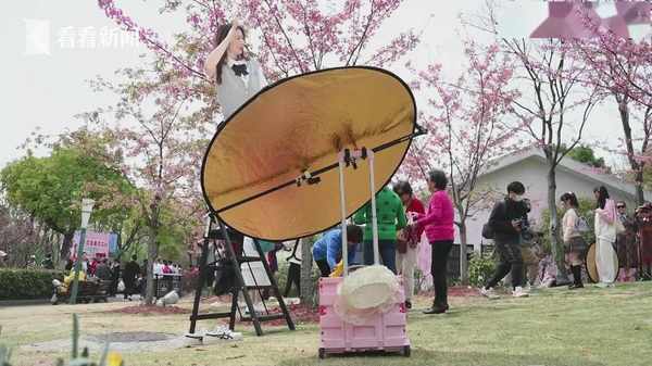反光板、摄影灯、小扶梯,甚至连鼓风机都用上,早樱盛放的顾村公园,沿着樱花大道往前走,几乎每棵树下都被各路“网红”们占据着,“笑的很好看很自然,稍稍含着下巴,眼睛看我”,诸如此类的声音此起彼伏。一位商业摄影师坦言:一天拍四五个,拍一个小时左右,包妆造跟不包妆造的套餐后拍正常服装跟汉服的都有分。