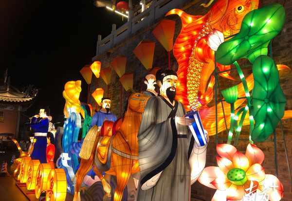 在牌坊街灯展区域,“牌坊文化+状元文化”是主流。主办方在23个牌坊中选取了10个有代表性的牌坊,挖掘牌坊背后故事,将状元文化元素融入灯组设计中,并以卡通花灯形象再现状元人物。