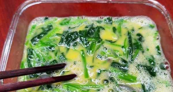 第三步:取一個保鮮盒,打入4個笨雞蛋,加入少量的鹽,用筷子將雞蛋打散。雞蛋攪散以後,將蝦肉和菠菜放進去,攪拌均勻,然後用勺子將表面的浮沫撇除乾淨。