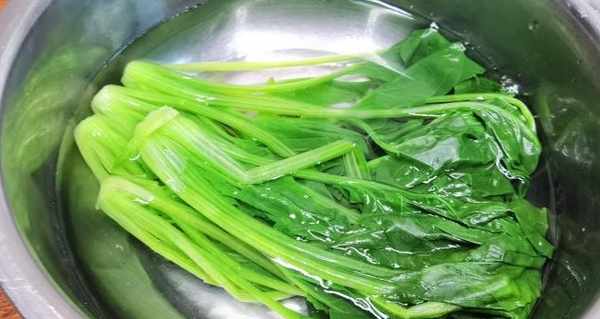 第二步:鍋內加水,燒至冒小泡,加入半勺鹽,然後將清洗乾淨的菠菜放入鍋中,焯一下水。加鹽可以使焯水後的菠菜翠綠不發黃。攪動一下使菠菜受熱均勻,焯水一分鐘後,將菠菜撈出過凉。菠菜過凉以後,控水撈出,放到案板上,切成大段。