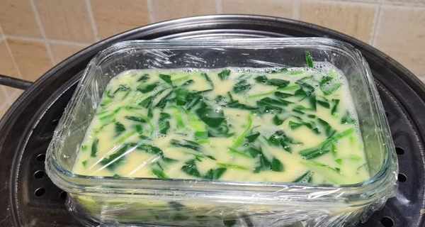 第四步:蓋上一層保鮮膜,用牙籤紮上小孔。蒸鍋內加入適量的水燒開,將保鮮盒放入鍋中,大火蒸15分鐘。十五分鐘後,菠菜鮮蝦雞蛋羹就蒸好了。
