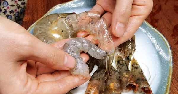 第一步:首先將大蝦的蝦頭取下來,再將蝦殼掰開,將蝦仁取出,然後切成小段,裝入碗中,加入少量鹽,加入適量的料酒,攪拌均勻,醃制15分鐘,給大蝦去腥。
