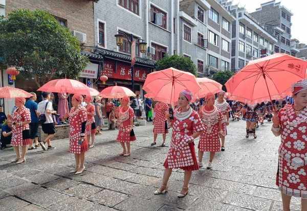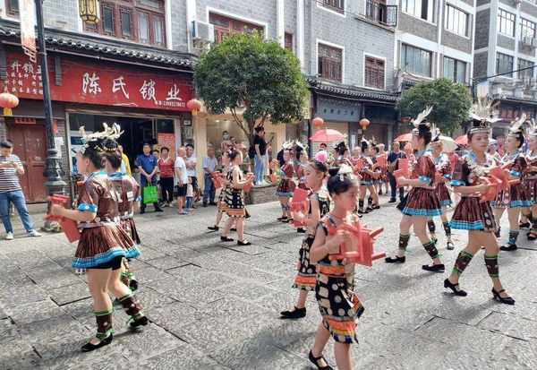 我游完下来,一路小跑才追上巡游的队伍,为了更好地拍摄,我越过密密匝匝的人群,从巡游队伍的尾巴一直追到队伍最前面,在队伍巡游前进的过程中,我抓紧拍摄,为迎接这次赛龙舟文化节,各个乡镇、街道、社区都精心组织了巡游的队伍,我们也得以见到苗、侗、土家等各民族的各式民族盛装,尤其是各式苗族盛装,女性头上戴的,身上穿的全是银饰,走起来发出清脆悦耳的声音,特别吸引人!每支队伍的人员组成、服装、舞蹈动作,演奏乐器等都不一样,看得你眼花缭乱,让你大饱眼福,而且一路锣鼓喧天,芦笙悠扬,铜号阵阵、唢呐声声,还让你大饱耳福!