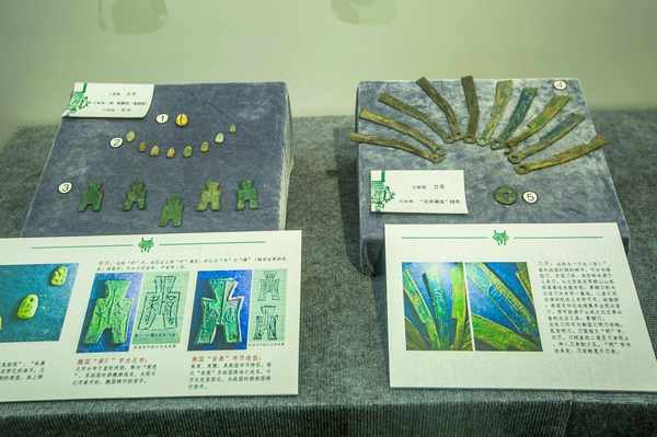 展柜内陈列了春秋战国时期各诸侯国所用的不同钱币,彼时布币、刀币、圜钱等四种青铜铸币并行,对交易往来是相当不方便的。直到秦始皇统一中国后,秦国所用圜钱,即圆形方孔钱才成为中国此后两千余年各朝各代的主流货币形制。